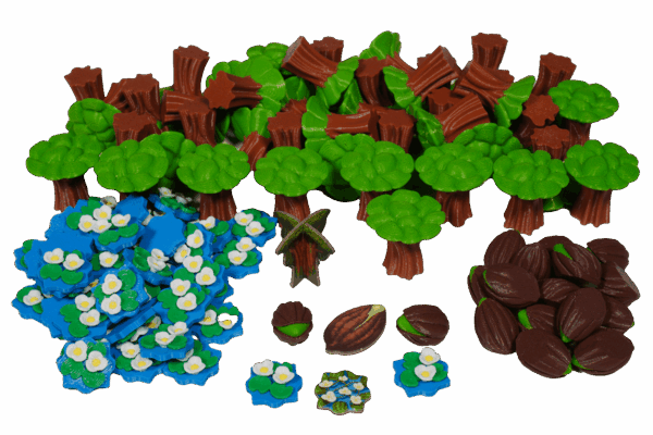 These 3D tokens for Life on Amazonia replace the flat cardboard markers for trees, seeds, and aquatic flowers, bringing the Amazon rainforest to life on the table. Trees rise as true 3D mangroves, aquatic flowers float on the rivers with leaves and blossoms, and seeds become grippy components that are intuitive to use.