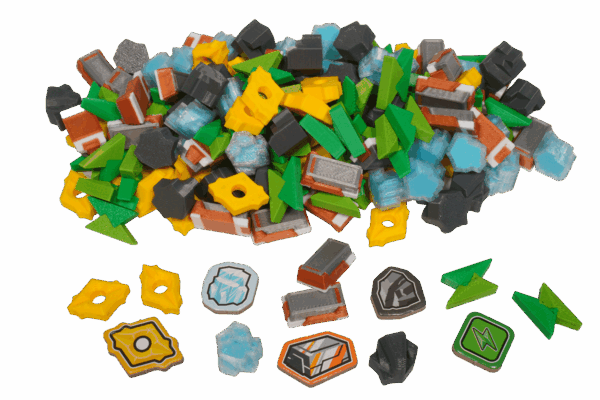 Energy, credits, ice, nanocarbon, and titanium are represented as 3D-printed resources, fully replacing the flat cardboard tokens. Each resource fits precisely onto the designated spaces of the player boards, keeping your station development clearly visible and easy to manage throughout the game.