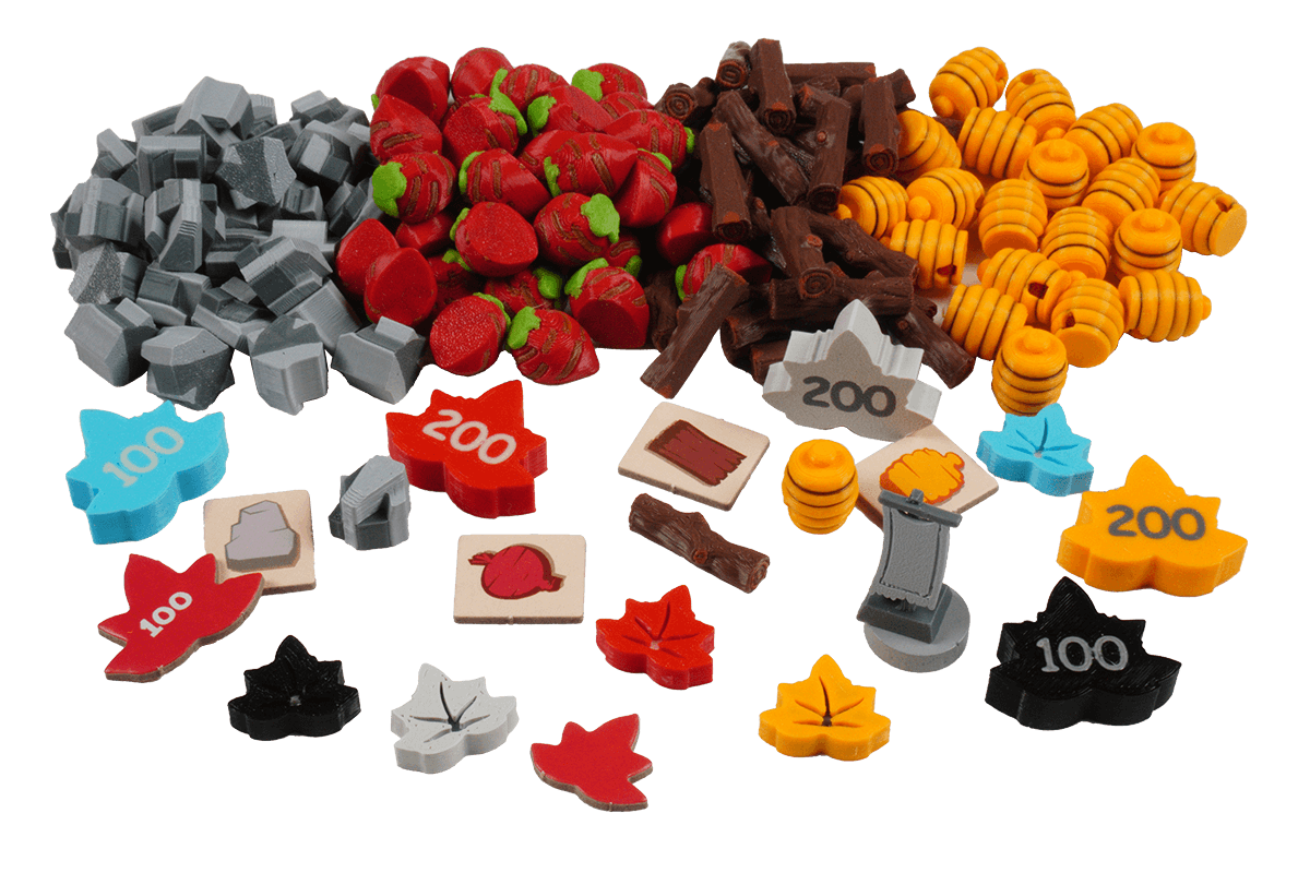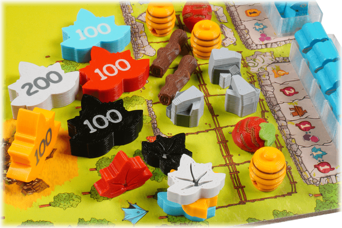 This set brings together everything you need for clarity and smooth gameplay: detailed 3D resources like beehives, stone, wood, and food, precisely matched player markers, and the distinctive flag to track your progress.