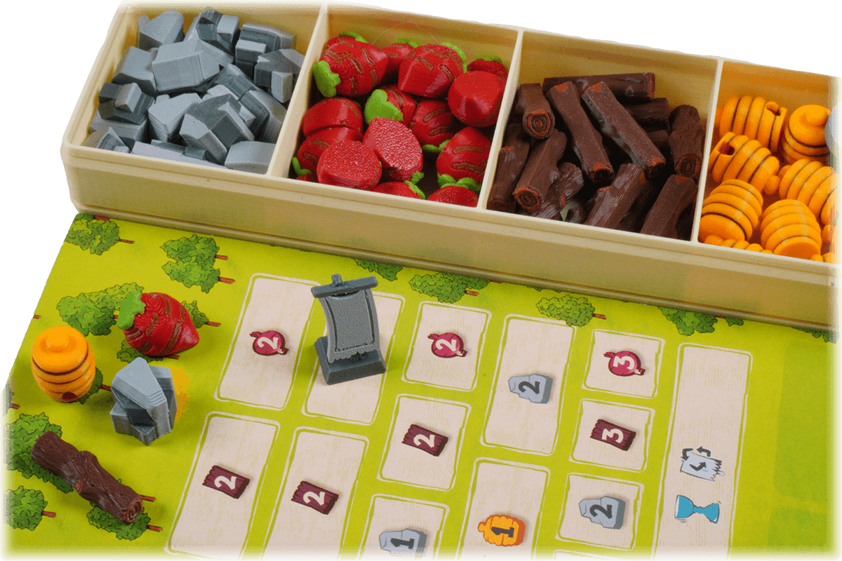 Beehives, stone, wood, and food become real eye-catchers on the table. Multicolored, precisely crafted, and with a satisfying tactile feel, these 3D tokens add noticeable depth to your game. They fit perfectly into the storage on the game board, keeping everything clear, organized, and elevating the overall premium feel.
