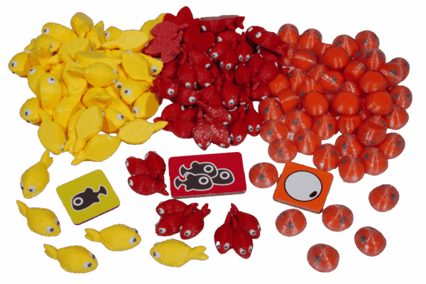 Yellow young fish and red school fish replace the flat cardboard markers with tangible tokens. At a glance, you can immediately see both size and value.