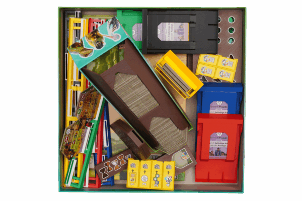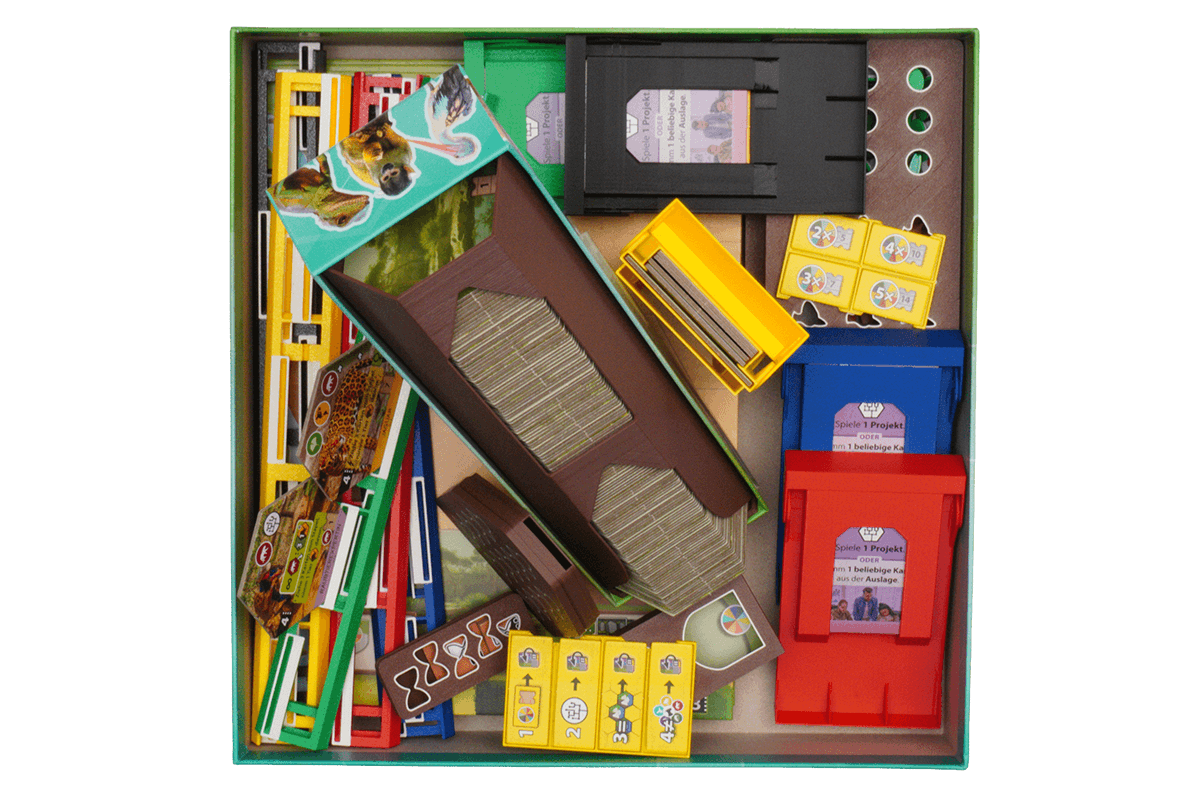 The player box in your color instantly brings order to your area and noticeably speeds up setup. Just take your components out of the box, place them on the table, and you’re ready to go faster than ever. Inside, everything is clearly structured: your action tiles are neatly sorted in their own compartment, always within reach. The player aid has a dedicated slot, and there’s an extra section for upgrade and conservation success markers—ready to be placed directly on the table without any sorting.
