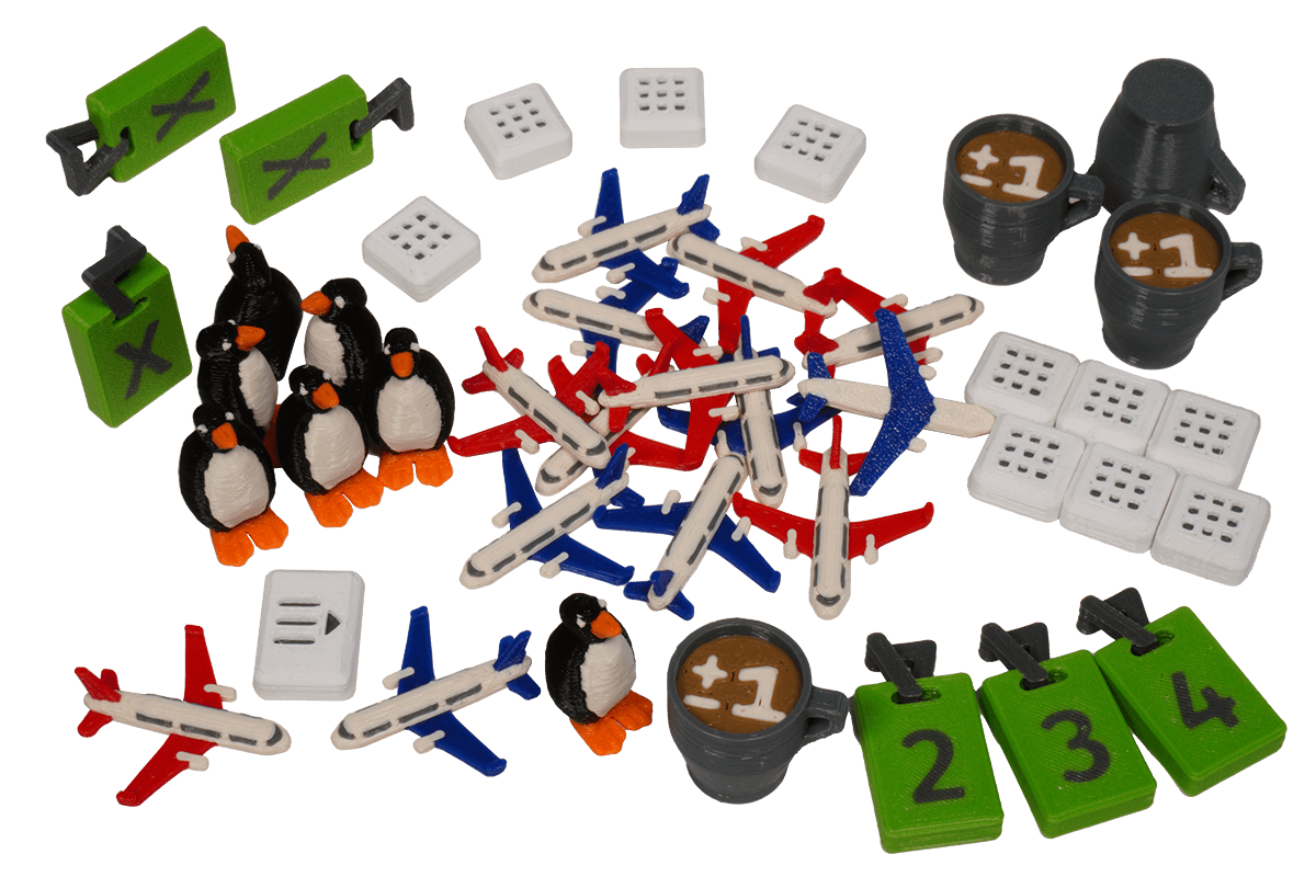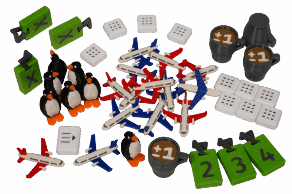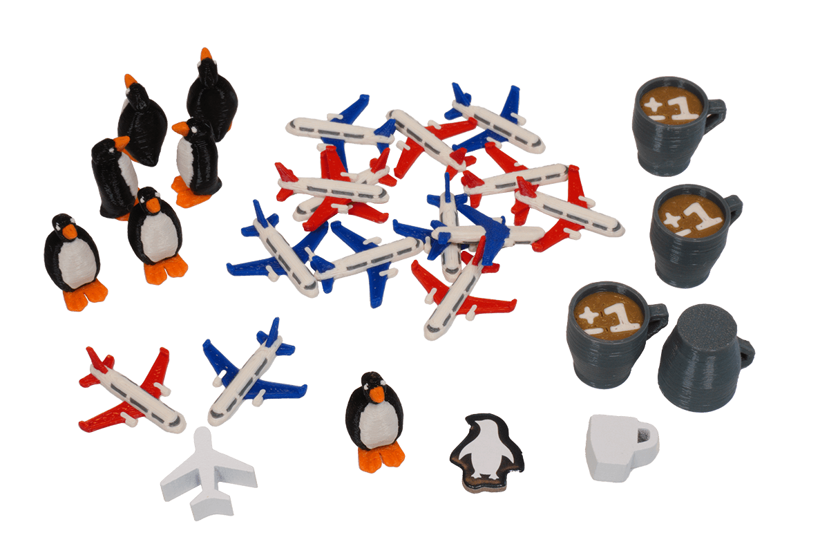 The coffee cup, planes, and penguin bring personality and humor to the game, replacing standard markers with components that are instantly recognizable. Every landing becomes more vivid, every decision clearer, and the cooperation more intense ā without changing the mechanics, but with much more atmosphere in the cockpit.