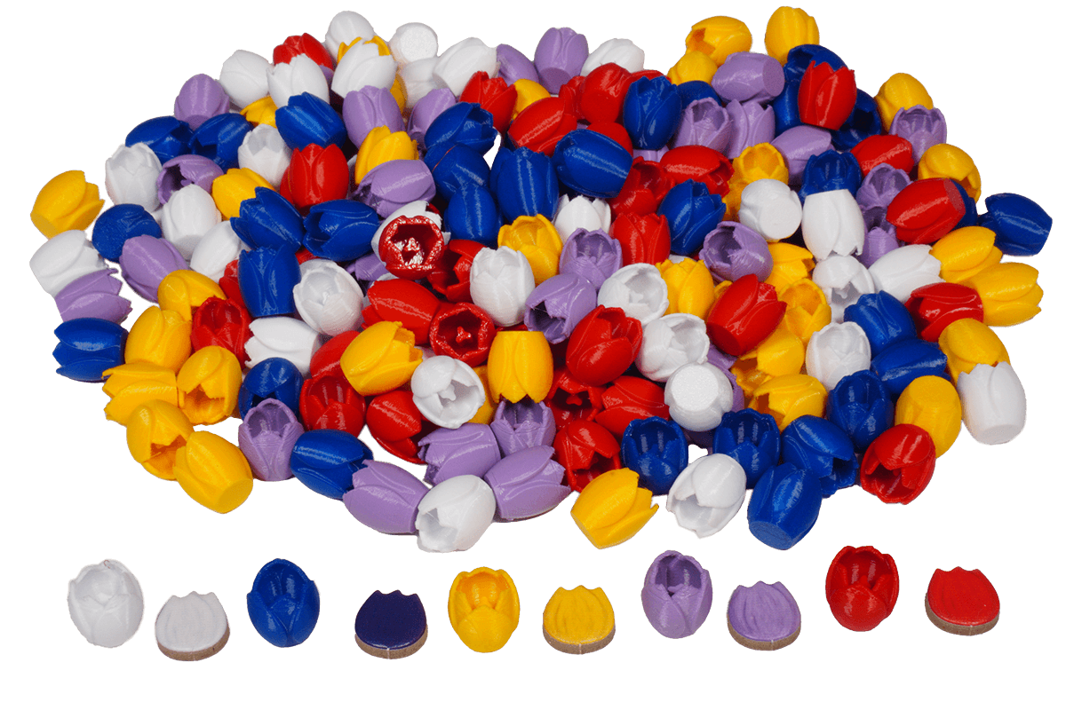 These tulips replace the small, flat cardboard markers with a large number of colorful 3D flowers. They fit perfectly on the player boards, are pleasant to handle, and bring clear structure to the game. The colors integrate harmoniously into the overall design and turn managing tulip bulbs into a true building experience – very much in the spirit of the Bloemen Route, where fields of blossoms once stood for wealth, risk, and ambition.